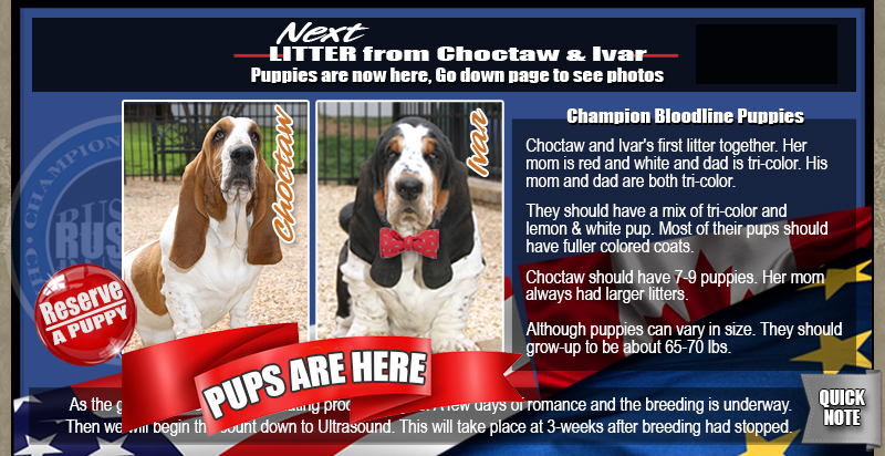 Located in a small town just outside of Charlotte, North Carolina USA. We work hard to improve the Basset Hound breed. What does that mean? You hear that from just about every Breeder you come to. For us, it means starting from the ground up. Each of our Basset Hounds were picked for different reasons. We started with different Champion Bloodline Puppies from all over the world. We looked at the environment where they lived, the temperament of the parents and the general color and placement of their markings. And not just the puppy, but also the litter that it came from. With some of the finest basset in the country, a lot of hard work and even some luck the RusBud Bloodline was born.